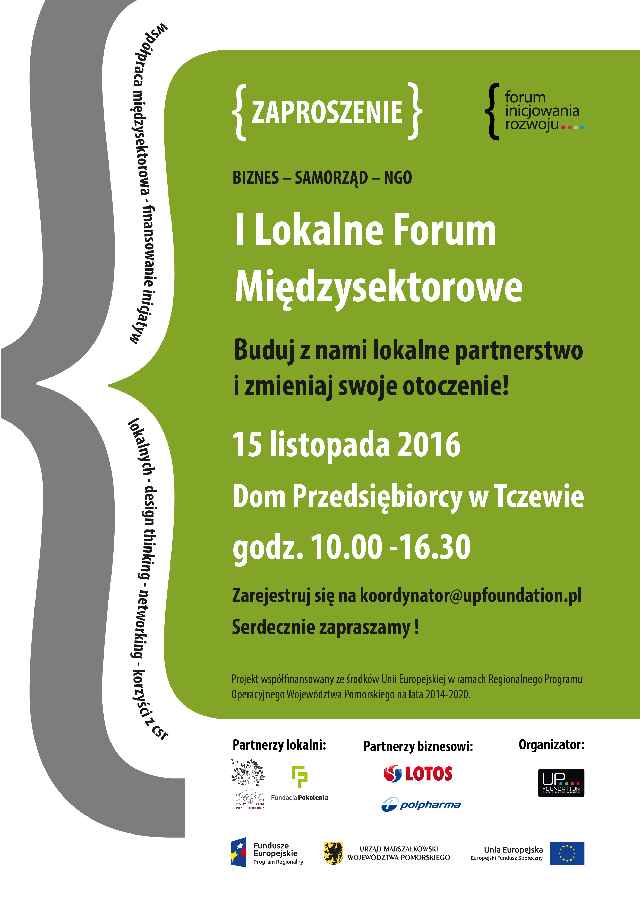 Forum Inicjowania Rozwoju wraz z Fundacją Pokolenia i Domem Przedsiębiorcy w Tczewie mają zaszczyt zaprosić na I Lokalne Forum Międzysektorowe, które odbędzie się 15 LISTOPADA 2016 w Domu Przedsiębiorcy. Tematem Forum będzie budowanie partnerstw lokalnych i zmienianie swego otoczenia. Celem wydarzenia jest pobudzenie współpracy międzysektorowej tj. administracji publicznej np. samorządu lokalnego, biznesu i organizacji…