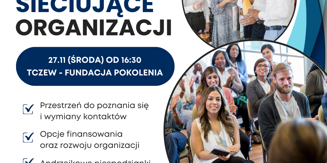 Zapraszamy pomorskie organizacje (fundacje, stowarzyszenia, kluby sportowe, koła gospodyń wiejskich, OSP, spółdzielnie socjalne i spółki non profit) na spotkanie sieciujące. Wydarzenie jest organizowane 27.11 (środa) od godz. 16:30 w Tczewie w Fundacji Pokolenia, przy ul. Obrońców Westerplatte 6. Organizatorzy zapewniają materiały oraz poczęstunek. A nawet losowanie atrakcyjnych nagród sposród osób uczestniczących i andrzejkowe niespodzianki! Udział w spotkaniu jest bezpłatny (wymagana jest jednak wcześniejsza rejestracja).