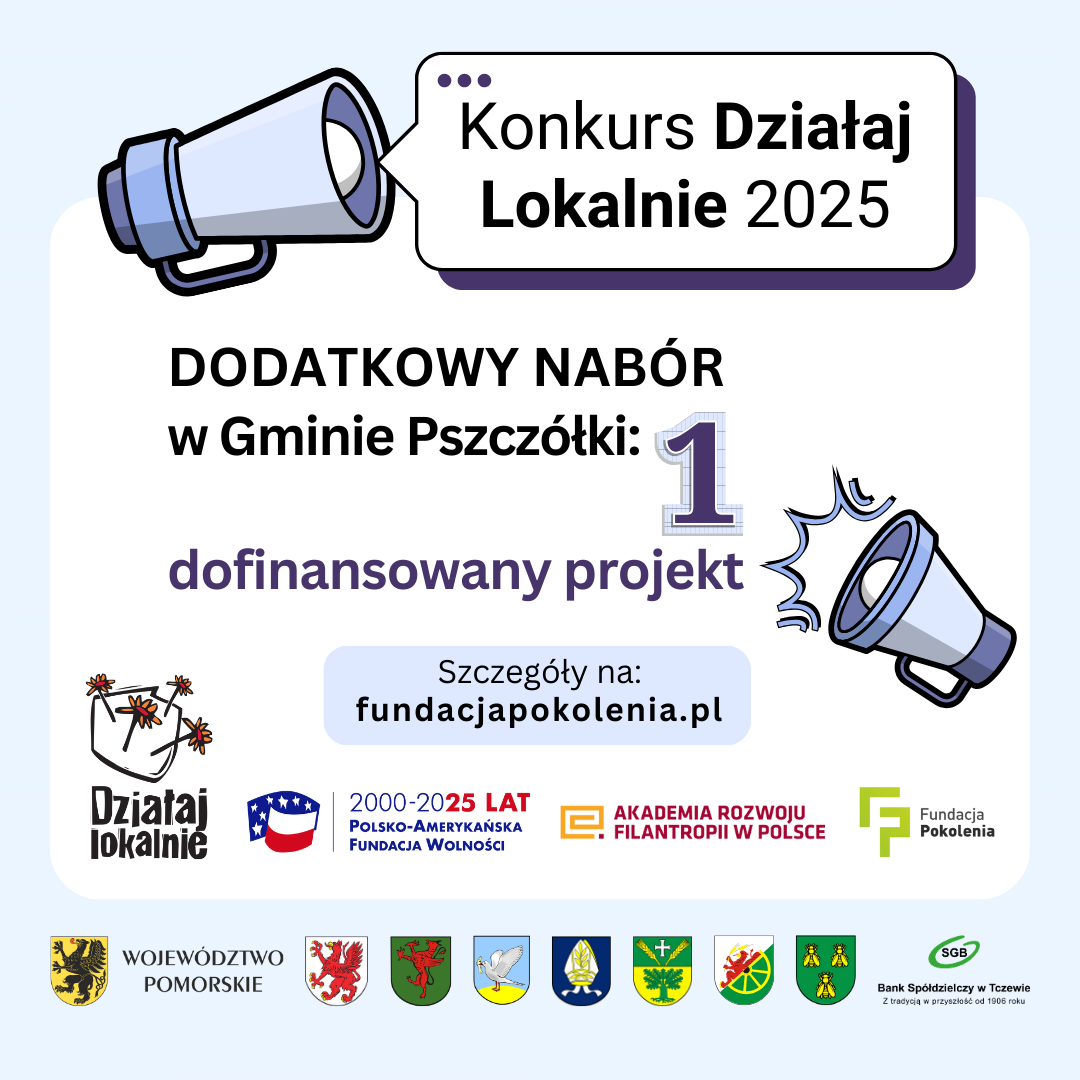Aktywność obywatelskaGrafika przedstawia ogłoszenie na jasnobłękitnym tle. Na górze znajduje się megafon z hasłem "Konkurs Działaj Lokalnie 2025". Niżej komunikat: Wyniki dodatkowego naboru w Gminie Pszczółki 1 dofinansowany projekt. Pod nim pole z treścią: Szczegóły na www.fundacjapokolenia.pl. Poniżej znajdują się logotypy: Programu Działaj Lokalnie, Fundatora - Polsko-Amerykańskiej Fundacji Wolności, Realizatora - Akademii Rozwoju Filantropii w Polsce, Partnera lokalnego - Fundacji Pokolenia. Na dole grafiki znajduje się pasek z logotypami podmiotów współfinansujących konkurs: herb Województwa Pomorskiego oraz Miasta Tczew i Gmin: Tczew, Gniew, Morzeszczyn, Pelplin, Subkowy, Pszczółki oraz logo Banku Spółdzielczego w Tczewie.