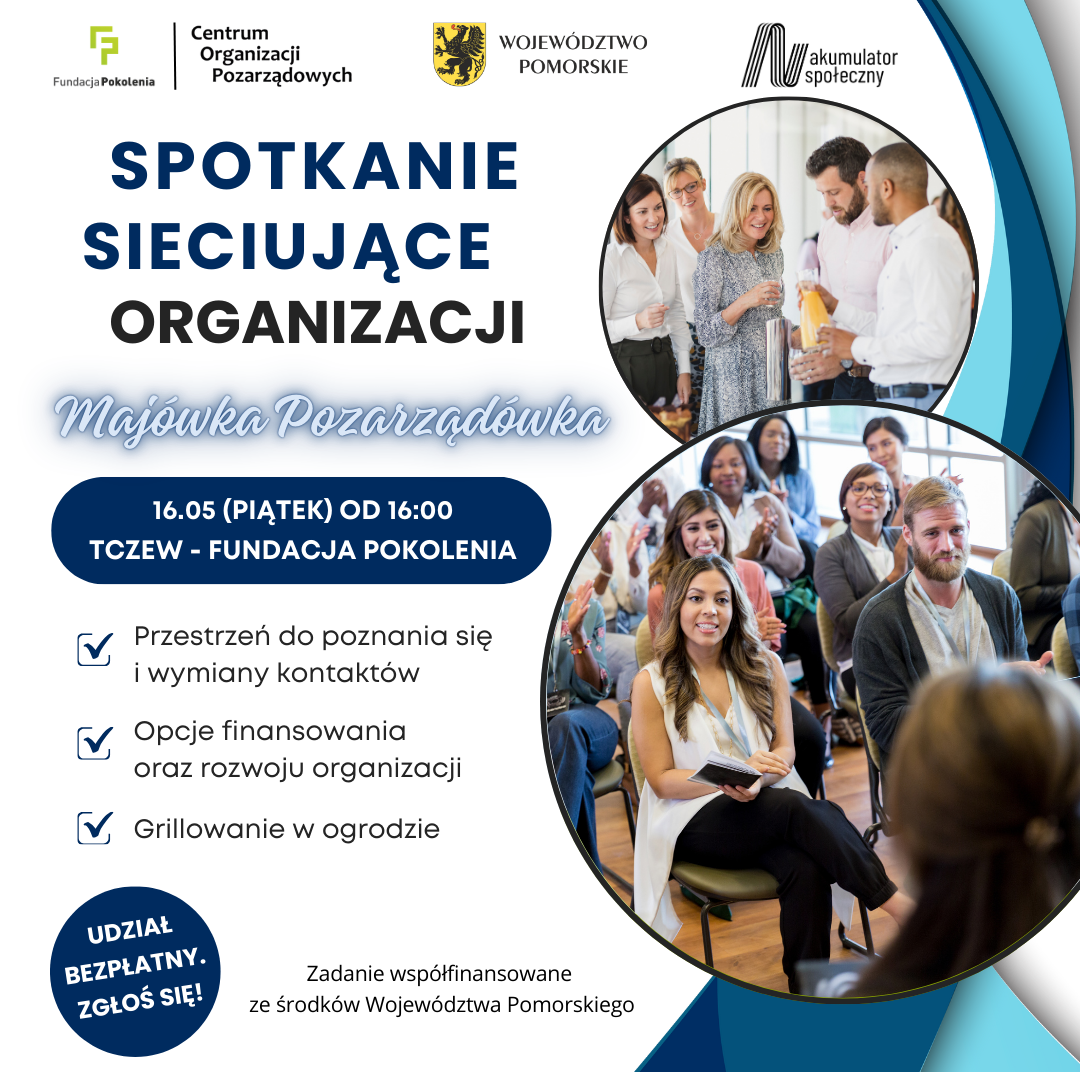 Zapraszamy pomorskie organizacje (fundacje, stowarzyszenia, kluby sportowe, koła gospodyń wiejskich, OSP, spółdzielnie socjalne i spółki non profit) na spotkanie sieciujące. Wydarzenie jest organizowane 16.05 (piątek) od godz. 16:00 w Tczewie w Fundacji Pokolenia, przy ul. Obrońców Westerplatte 6. Organizatorzy zapewniają materiały oraz poczęstunek. A nawet losowanie atrakcyjnych nagród spośród osób uczestniczących! Udział w spotkaniu jest bezpłatny (wymagana jest jednak wcześniejsza rejestracja).