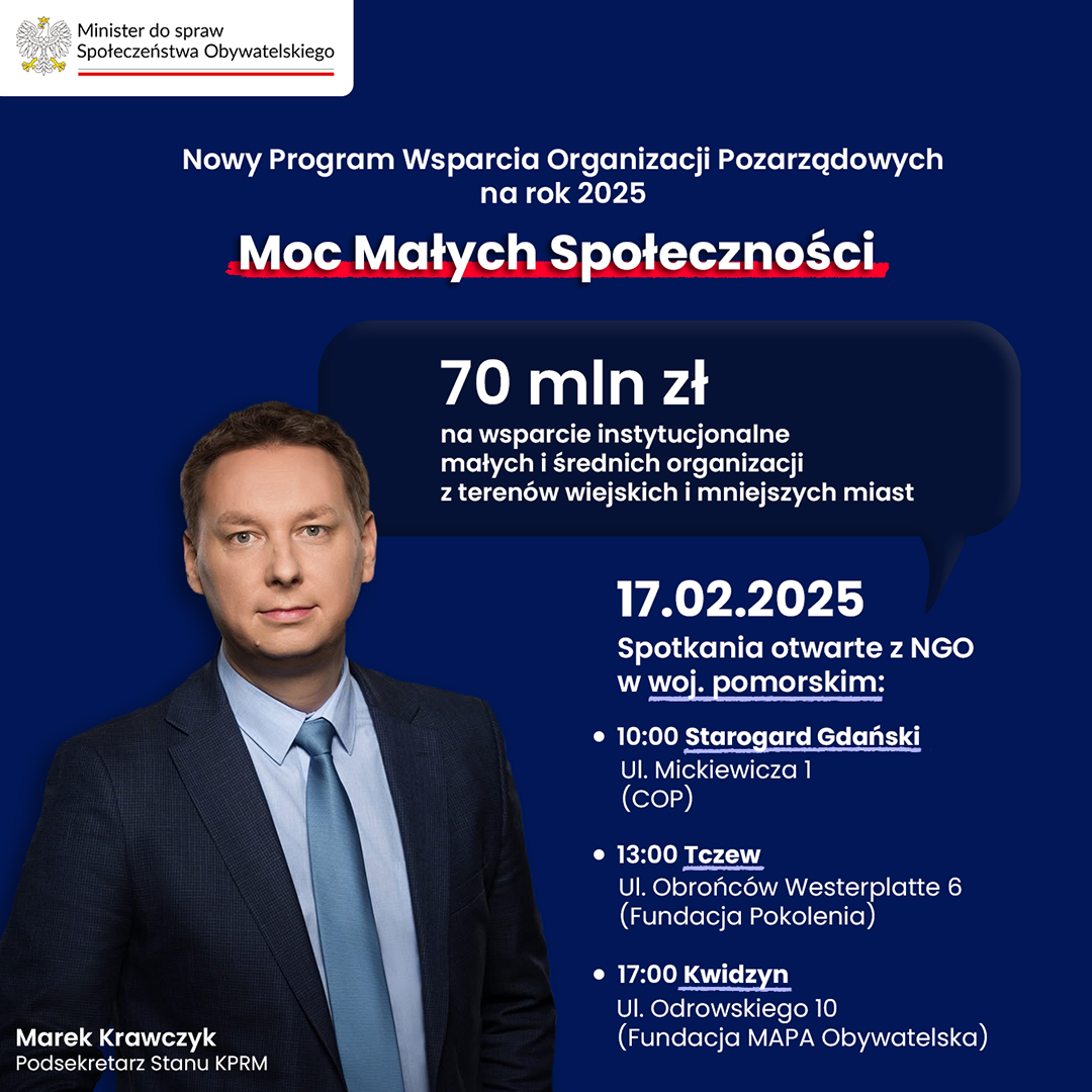 Ministra ds. Społeczeństwa Obywatelskiego Adriana Porowska oraz Podsekretarz Stanu KPRM Marek Krawczyk serdecznie zapraszają przedstawicieli trzeciego sektora do udziału spotkaniach dotyczących nowego Rządowego Programu Wsparcia Organizacji Pozarządowych na rok 2025 – „Moc Małych Społeczności”.